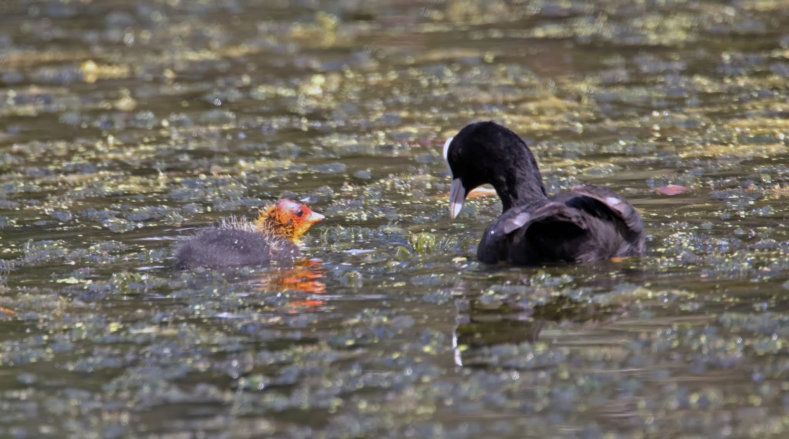 Deze meerkoet heeft nog laat in het seizoen een jong.